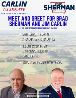 Join us for a Meet & Greet for both Jim Carlin and Brad Sherman at State Senator Sandy Salmon's home in Janesville. Light refreshments will be served.